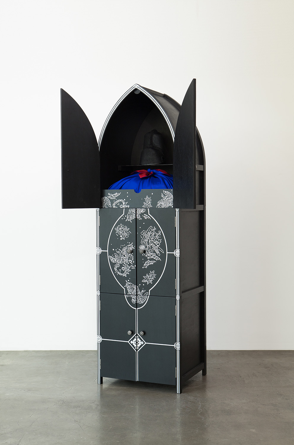 <맥베스 부인의 장롱> 은 서양의 대표적인 고전을 동양적으로 재해석하여 음악, 의상, 무용 등 연극의 구성 요소 모두 동양의 상징으로 채워진다. 이 프로젝트에서는 극의 흐름에 따라 변하는 레이디 맥베스의 의상을 담는 장롱을 디자인하는 과제가 주어 졌다. 서양의 고전과 동양의 전통 의복이 담길 이 장롱을 위해, 네오 고딕 양식과 한국의 전통 자개 패턴을 차용하여 동서양이 어우러지는 새로운 양식을 제시했다. 이 오브제는 탐욕과 권위, 죽음 등 연극에 등장하는 상징을 다양하게 은유 한다. 키가 큰 네오 고딕 조형의 장롱은 관의 형태 와도 닮아 있다. 또한 극의 흐름에 따라 상부에서 하부로, 옷을 꺼내기 위해 점점 바닥을 향하는 시퀀스는 파국을 넘어 죽음에 다다르는 그녀의 운명을 암시한다.
